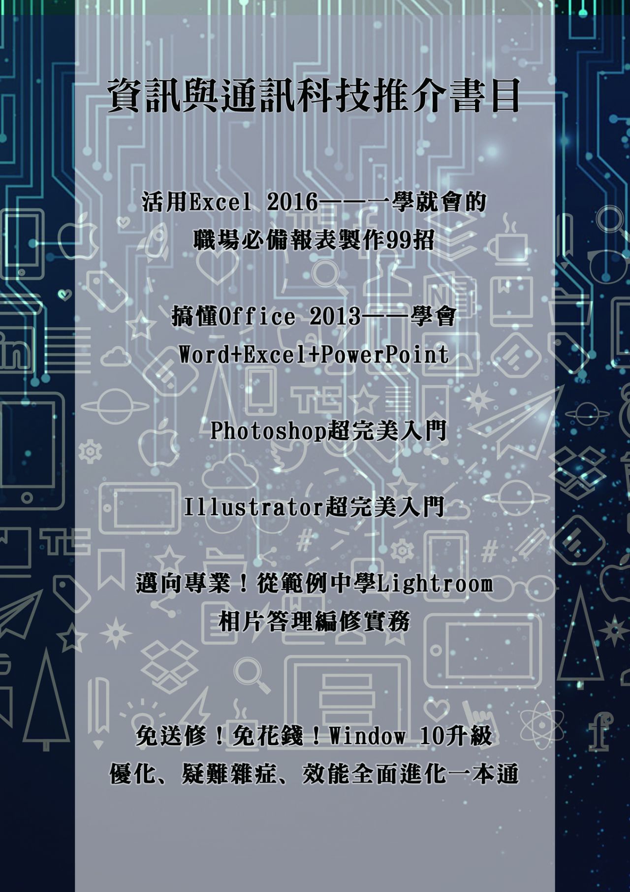 圖書館館藏備有不同專業技能的入門﹑深化書籍——如認識Microsoft﹙Word﹑Excel等等﹚﹑adobe﹙Photoshop﹑Illustrator﹑Premiere等等﹚常見軟件的應用教學書;手工製作﹑投資管理﹑山藝技能等不同類別的入門書籍,使同學於課餘時間自我增值。
