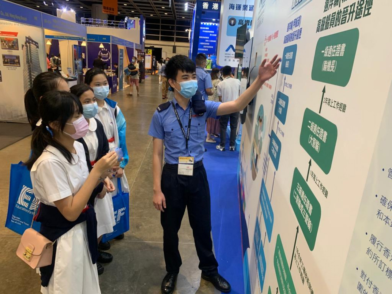 義工隊隊員於教育及職業博覽會向其他學生介紹海事行業
